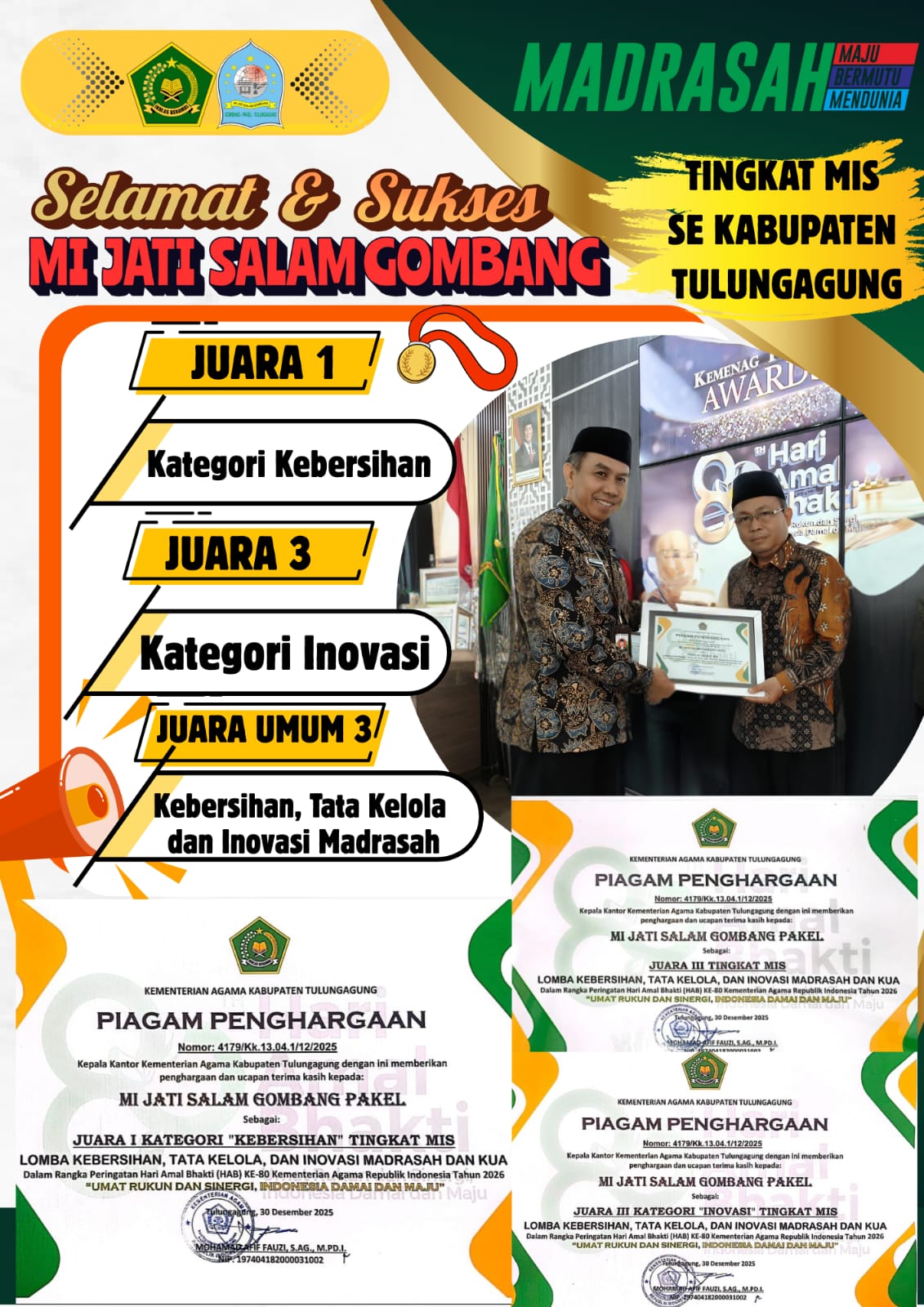 Mengawali di tahun 2026 ini Madrasah Ibtidaiyah Jati Salam Gombang Pakel Tulungagung mendapatkan kado istimewa yaitu mendapatkan prestasi bergengsi dalam kategori Madrasah Ibtidaiyah Swasta (MIS) se Tulungagung yang diselenggarakan Kementerian Agama Kabupaten Tulungagung. Prestasi tersebut diantaranya: